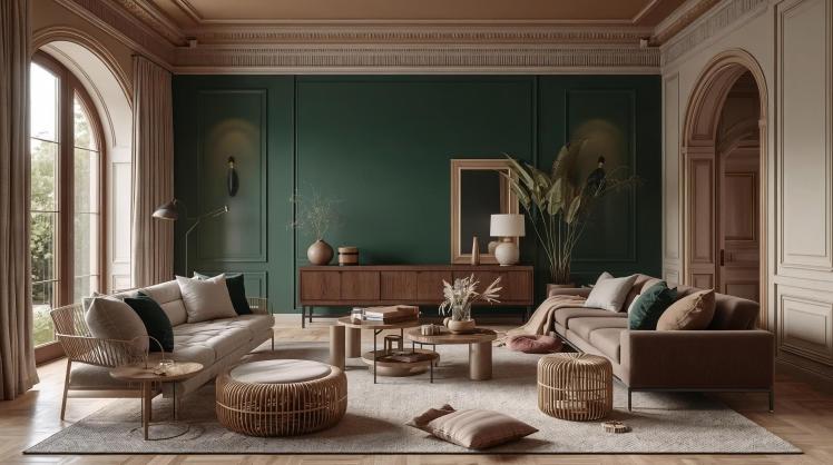 Oak, walnut, and darker woods echo emerald’s natural roots. Together, they create a space that feels layered, lived-in, and quietly luxurious.